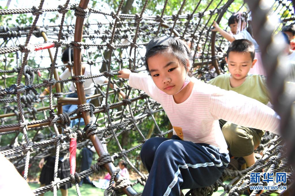 5月1日,孩子們?cè)趶V西南寧市青秀山風(fēng)景區(qū)陸地拓展競(jìng)技樂園玩耍。