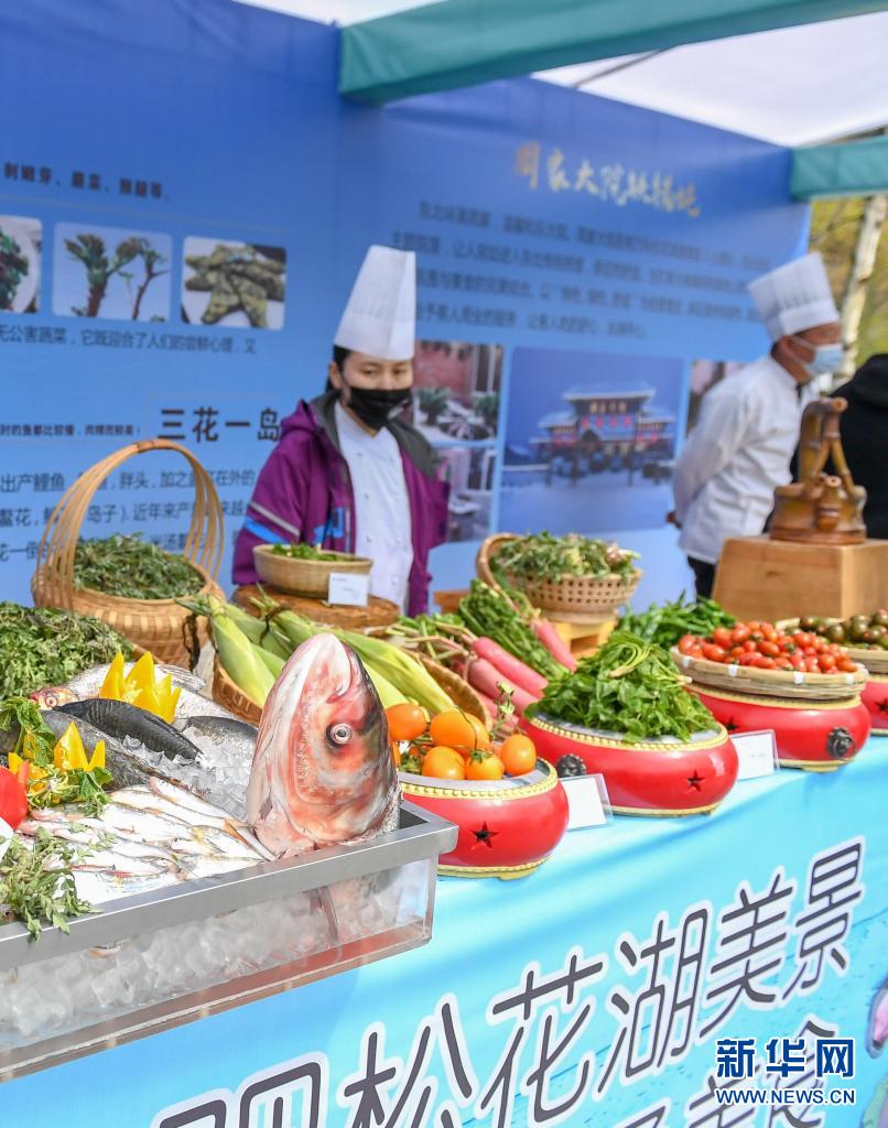 5月1日,在吉林市萬科松花湖度假區(qū)夏季運營啟幕儀式現場,廚師展示開江魚和山野菜等當地特色美食。