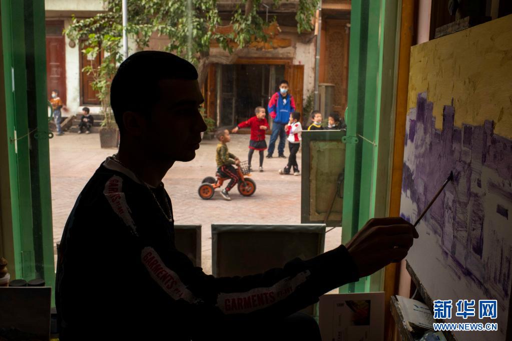 麥麥提吐爾遜江·麥麥提依明在位于新疆喀什古城景區(qū)的工作室內進行創(chuàng)作(5月5日攝)。新華社記者 胡虎虎 攝