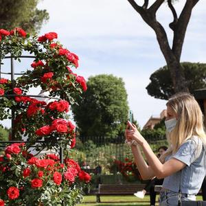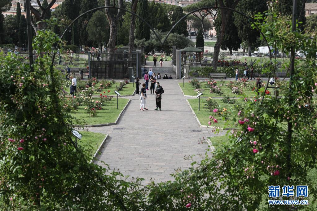 5月17日,人們?cè)谝獯罄锥剂_馬玫瑰園游覽。