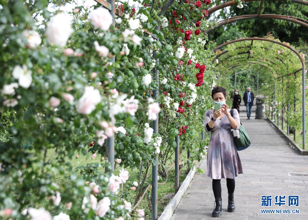 5月17日,一名女子在意大利首都羅馬玫瑰園拍攝照片。
