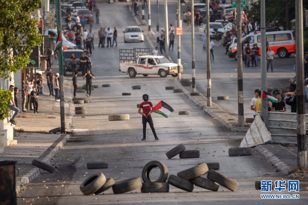 5月20日,抗議者手持巴勒斯坦國(guó)旗站在約旦河西岸城市伯利恒一條被封鎖的路上。