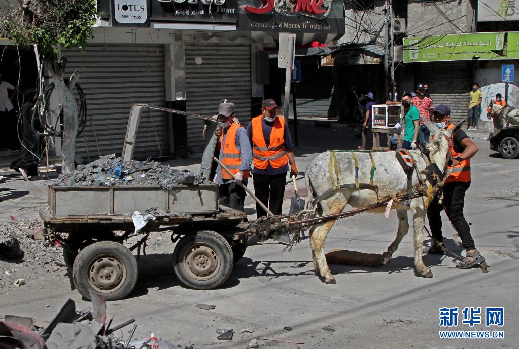 5月23日,巴勒斯坦志愿者清理加沙城一處遭到以色列轟炸后的建筑殘骸。