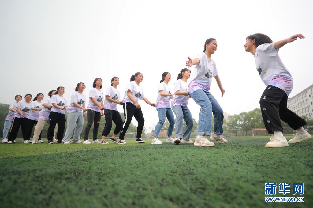 5月25日,湖南省衡陽市衡陽縣第一中學(xué)的高三學(xué)生在晨練中玩老鷹捉小雞游戲。