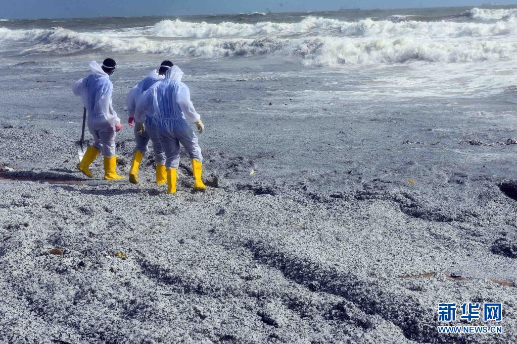 5月27日,安全人員在距離科倫坡30多公里的斯里蘭卡西海岸城市尼甘布清理被海水沖到這里的集裝箱船“X-PRESS PEARL”的碎片。