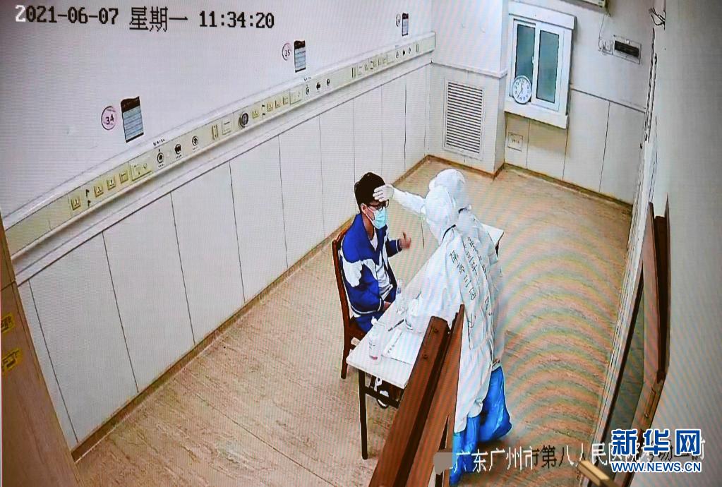 6月7日,廣東省國家教育考試指揮中心的監(jiān)控畫面顯示,上午語文考試結束后,廣州市八醫(yī)院嘉禾院區(qū)醫(yī)護人員對隔離病房考生的試卷、答題卡、稿紙等用品進行消毒時,用手背為考生腦門探熱。新華社記者 劉大偉 攝