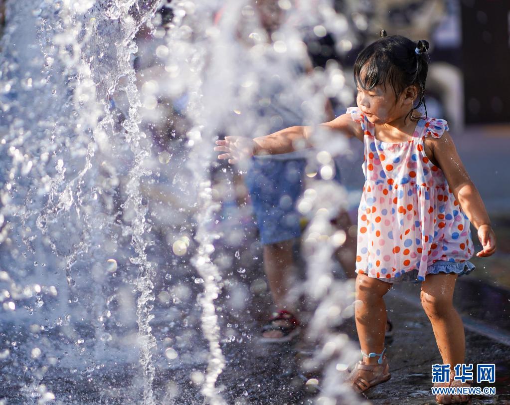 6月20日,小女孩在北京華熙LIVE·五棵松商業(yè)街區(qū)一處噴泉戲水。