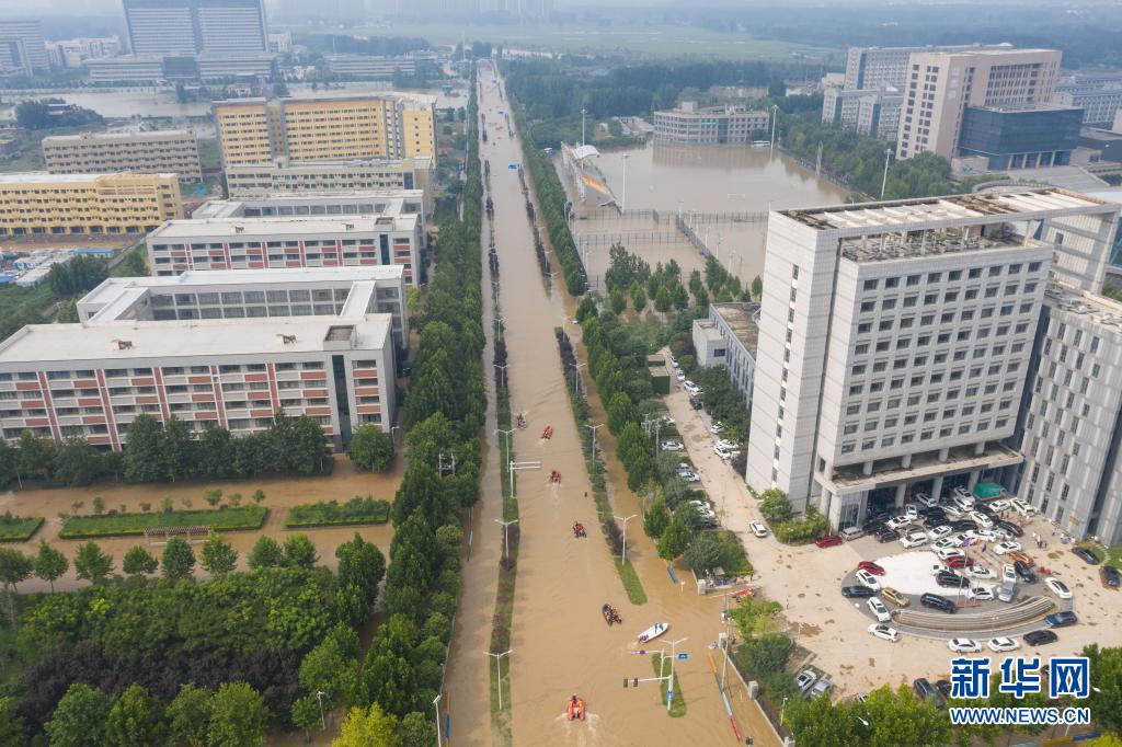 7月22日,在阜外華中心血管病醫(yī)院附近的錦繡路與鄭開大道交叉口,救援人員利用舟艇轉(zhuǎn)移人員(無人機(jī)照片)。