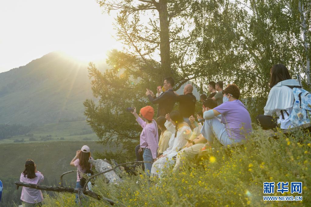 7月23日,游客在觀景臺(tái)上拍攝禾木村的落日。
