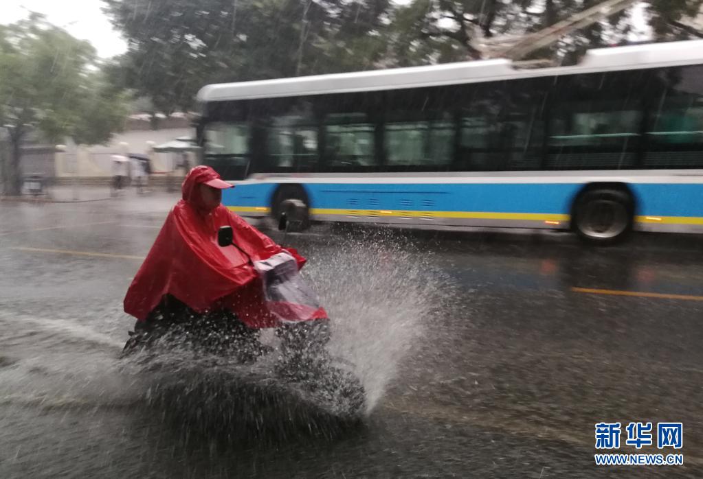 7月27日,在北京西單附近,騎行者經(jīng)過一處公交車站(手機(jī)拍攝)。
