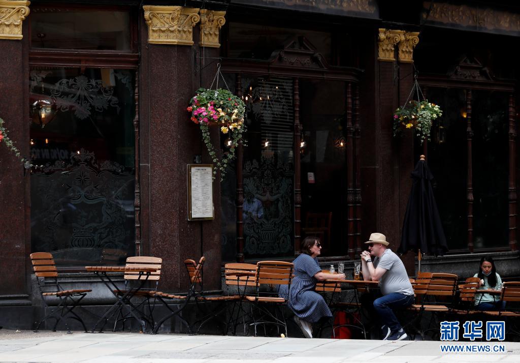 7月26日,人們坐在英國倫敦市中心一家酒吧的戶外餐飲區(qū)。