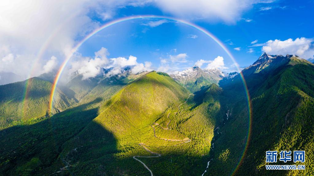 這是7月6日拍攝的米林縣派鎮(zhèn)至墨脫公路上的彩虹(無人機(jī)照片)。