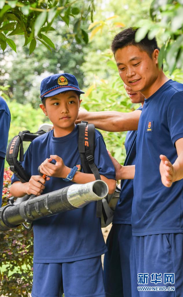 在四川省森林消防總隊特勤大隊,消防員王波平帶著一名孩子在體驗風(fēng)力滅火機(jī)(7月27日攝)。