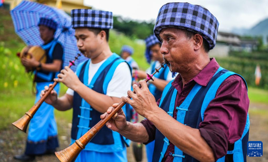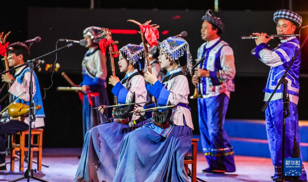 黔西南布依族苗族自治州的布依族群众在表演《八音坐唱》(6月29日摄)。