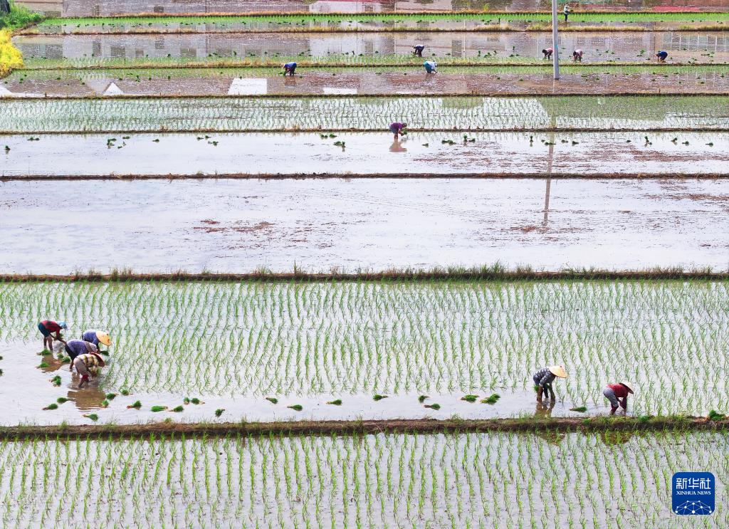 7月13日,湖南省衡阳市衡东县霞流镇农民在抢插晚稻(无人机照片)。