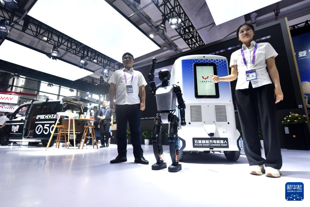 9月19日在南宁国际会展中心拍摄的一台智能充电机器人。