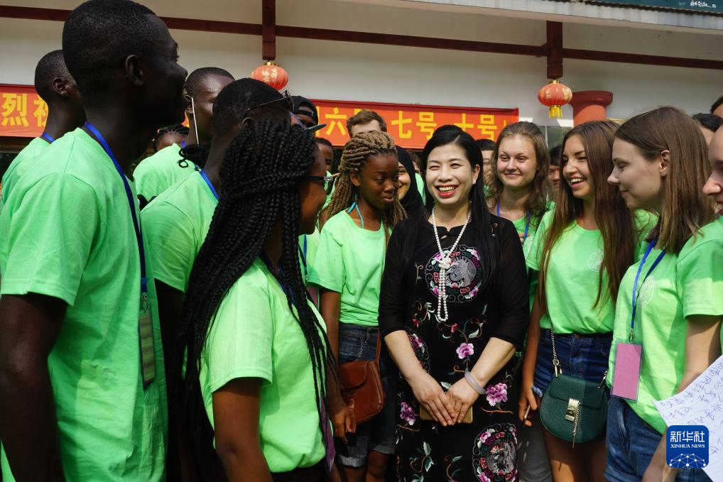江再红(中)给外国留学生讲解湘绣知识(资料照片)。