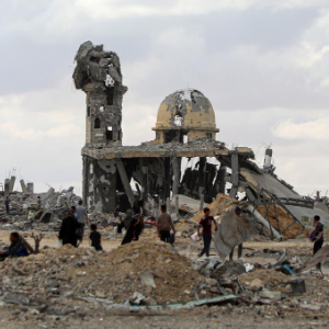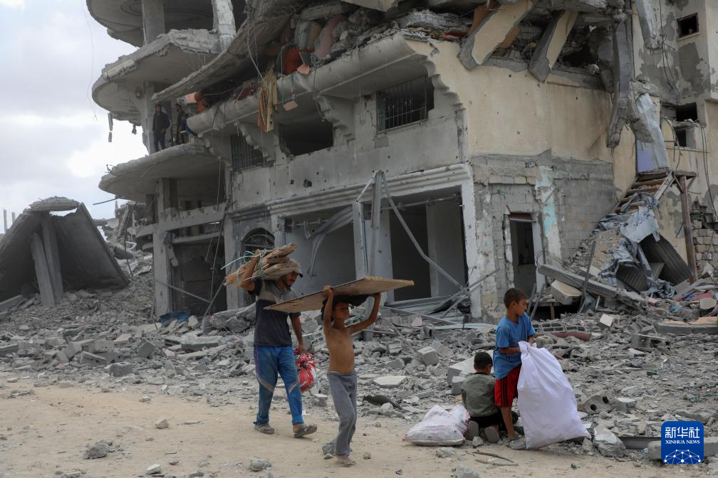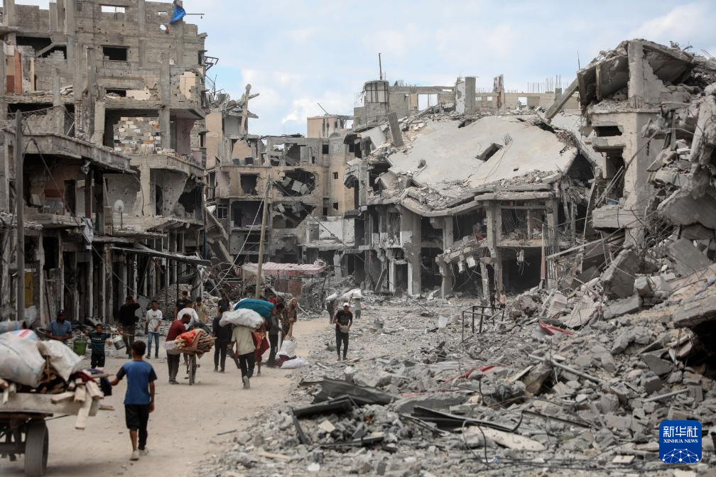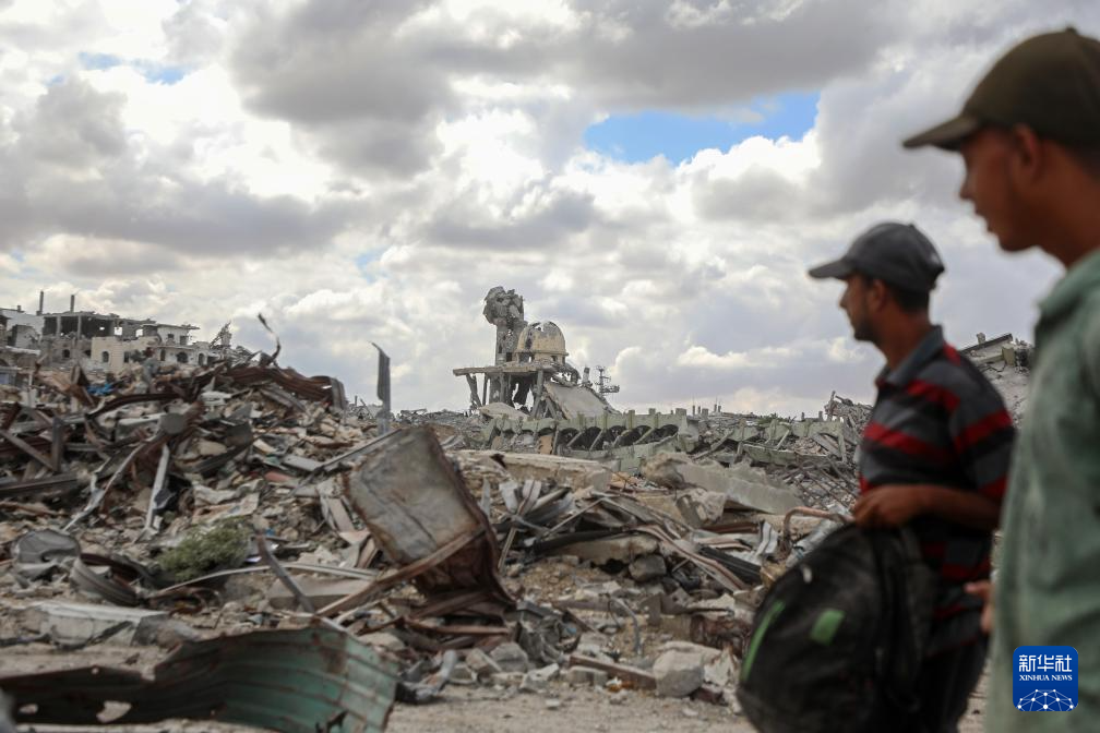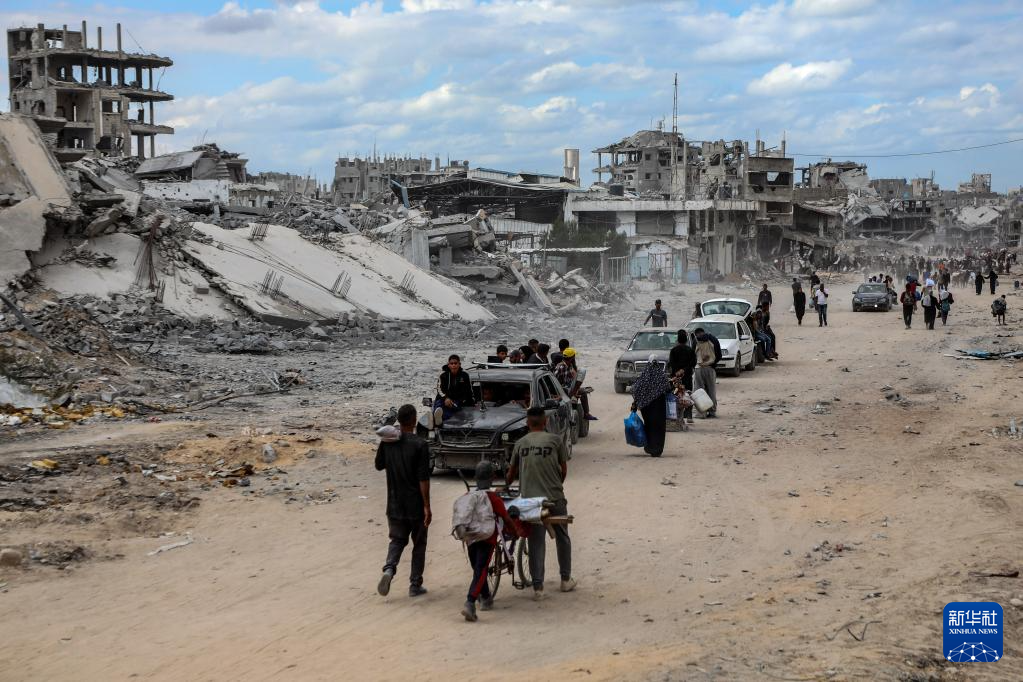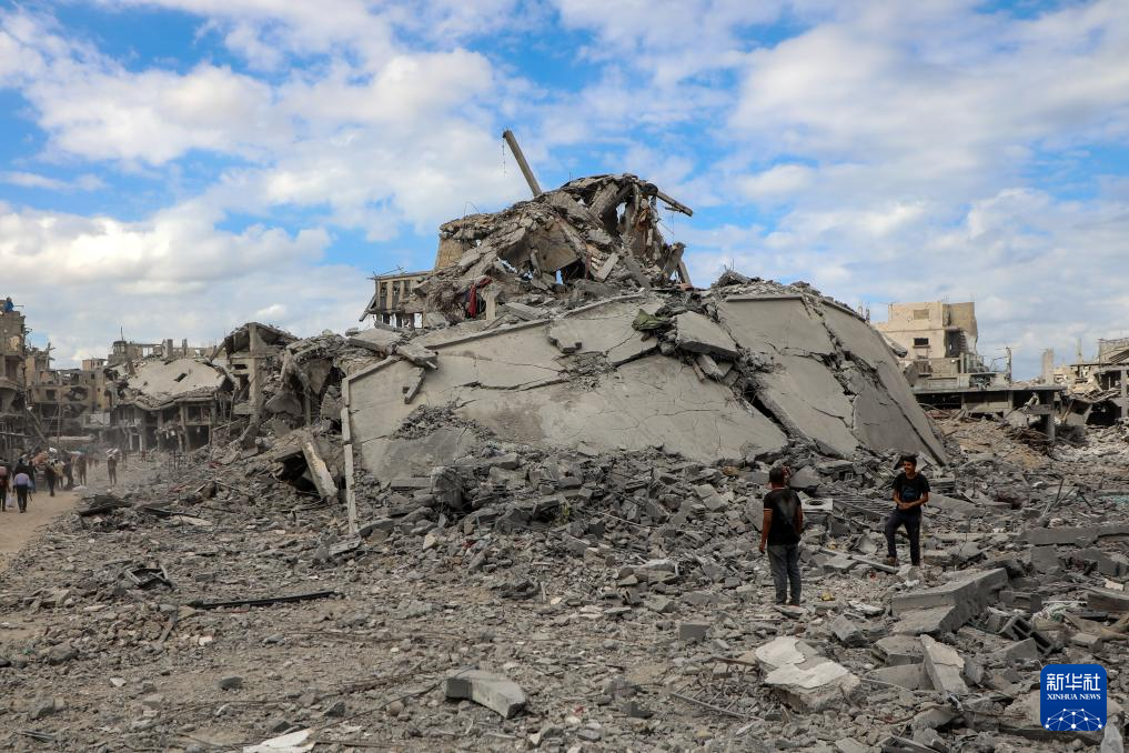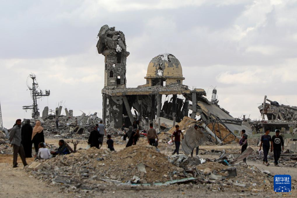 10月12日,在加沙地带南部汗尤尼斯,重返家园的巴勒斯坦人走过严重受损的建筑。