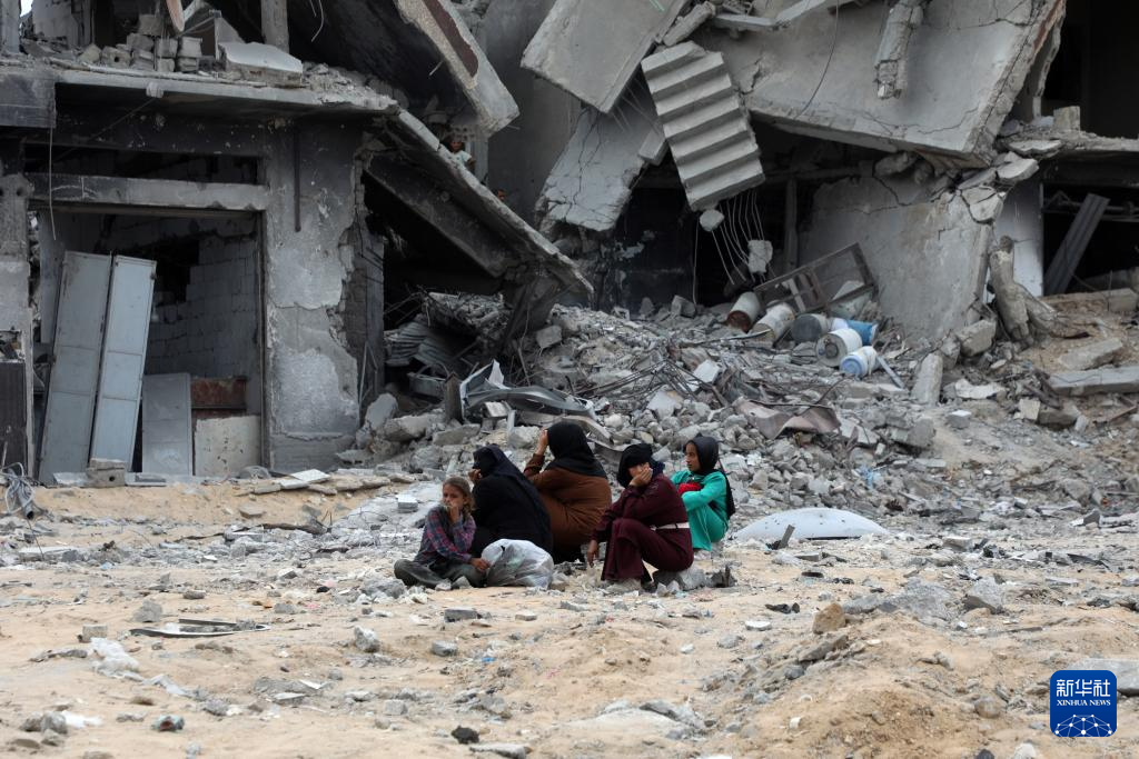 10月12日,在加沙地带南部汗尤尼斯,重返家园的巴勒斯坦人坐在废墟中。
