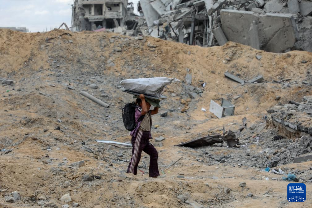 10月12日,在加沙地带南部汗尤尼斯,重返家园的巴勒斯坦人走在废墟中。
