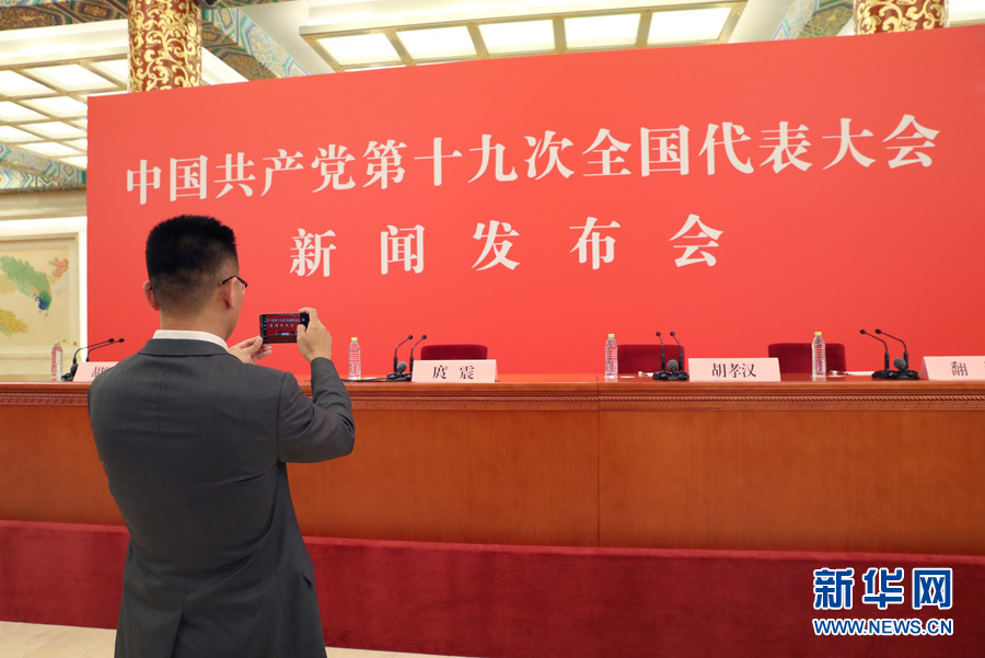 2017年10月17日下午,中國(guó)共產(chǎn)黨第十九次全國(guó)代表大會(huì)新聞發(fā)言人在人民大會(huì)堂三樓金色大廳舉行新聞發(fā)布會(huì),并回答中外記者提問(wèn)。圖為記者在新聞發(fā)布會(huì)現(xiàn)場(chǎng)拍攝。新華網(wǎng) 翟子赫 攝