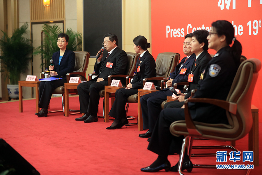 ??? 10月19日,十九大新聞中心舉辦集體采訪,邀請(qǐng)政法戰(zhàn)線代表談全面推進(jìn)依法治國(guó)。圖為采訪現(xiàn)場(chǎng)。新華網(wǎng) 郝廣鵬攝