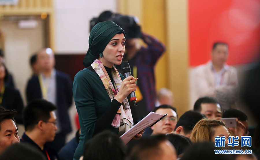 10月22日,十九大新聞中心在梅地亞中心二層新聞發(fā)布廳舉辦集體采訪(fǎng)活動(dòng),主題為“中國(guó)特色強(qiáng)軍之路邁出堅(jiān)定步伐”。圖為迪拜中阿衛(wèi)視記者提問(wèn)。新華網(wǎng) 郝廣鵬攝