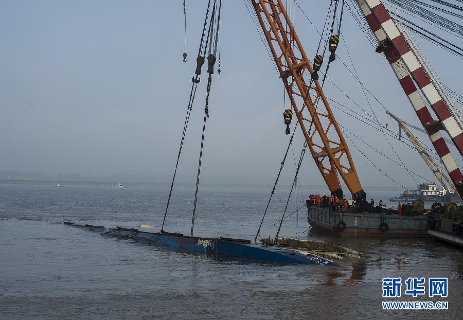 新華網(wǎng)湖北監(jiān)利6月5日電(記者皮曙初、王賢)記者在“東方之星”沉船施救現(xiàn)場(chǎng)看到,7時(shí)40分,“東方之星”船體已側(cè)翻過來,露出“東方之星”四個(gè)大字,藍(lán)色的船體也已露出水面。