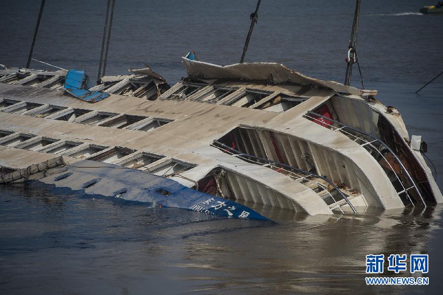 ??? 經(jīng)過(guò)連續(xù)3天的生命搜救后,長(zhǎng)江“東方之星”救援5日實(shí)施整體扶正打撈,繼續(xù)全力搜救遇險(xiǎn)人員。5日8時(shí)30分左右,“東方之星”沉船正在被扶正,船頂大部分露出水面,頂部以下已露出三層。