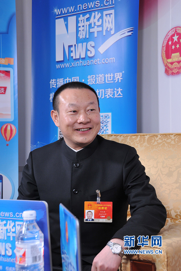 ??? 2015年3月12日,全國人大代表劉文新在人民大會堂新華網/中國政府網兩會訪談間接受記者專訪。新華網/中國政府網?李非 攝