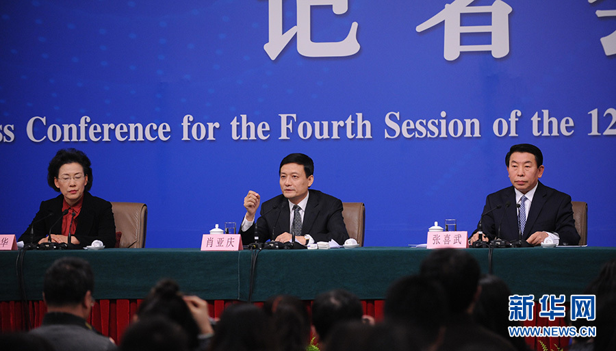 ?????十二屆全國人大四次會(huì)議新聞中心于3月12日(星期六)14時(shí)30分在梅地亞中心多功能廳舉行記者會(huì),邀請(qǐng)國務(wù)院國有資產(chǎn)監(jiān)督管理委員會(huì)主任肖亞慶、副主任張喜武、副主任黃丹華和副秘書長、新聞發(fā)言人彭華崗就“國企改革”的相關(guān)問題回答中外記者的提問。圖為肖亞慶回答記者提問。新華網(wǎng)/中國政府網(wǎng) 陳杰 攝