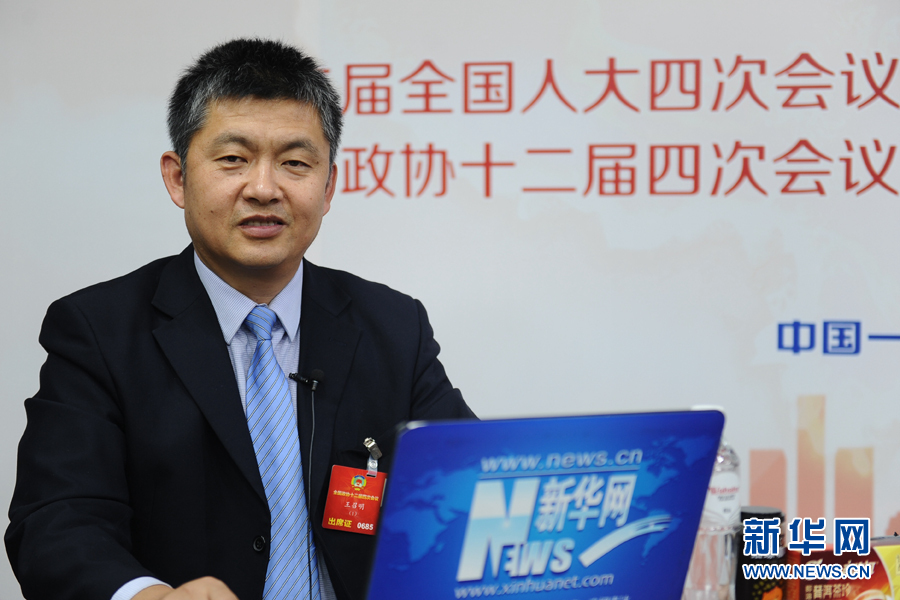 ??? 2016年3月12日,全國(guó)政協(xié)委員,內(nèi)蒙古蒙草公司董事長(zhǎng)兼總經(jīng)理王召明做客新華網(wǎng)兩會(huì)訪談。圖為王召明在訪談現(xiàn)場(chǎng)。新華網(wǎng) 賈海元 攝