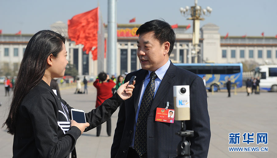 ?????3月14日,全國(guó)政協(xié)十二屆四次會(huì)議在北京人民大會(huì)堂舉行閉幕會(huì)。這是全國(guó)政協(xié)委員在人民大會(huì)堂外接受記者采訪。新華網(wǎng)/中國(guó)政府網(wǎng)??陳杰 攝