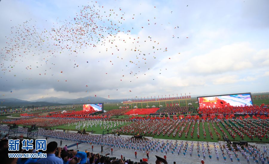 8月8日,內(nèi)蒙古自治區(qū)成立70周年慶祝大會在呼和塔拉內(nèi)蒙古少數(shù)民族群眾文化體育運(yùn)動中心舉行。圖為群眾行進(jìn)表演。新華網(wǎng)記者 陳杰 攝