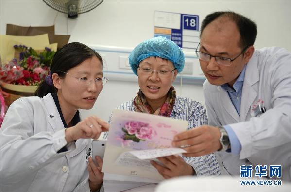 郭璐萍(中)在觀看即將援非的醫(yī)療隊(duì)成員為她創(chuàng)作的詩歌和集體簽名卡片。