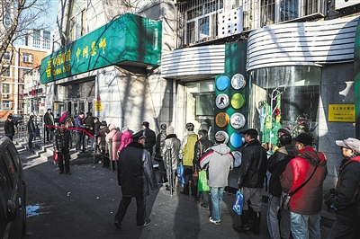 中國(guó)郵政工體北路郵政支局門口,市民排隊(duì)購買郵票。