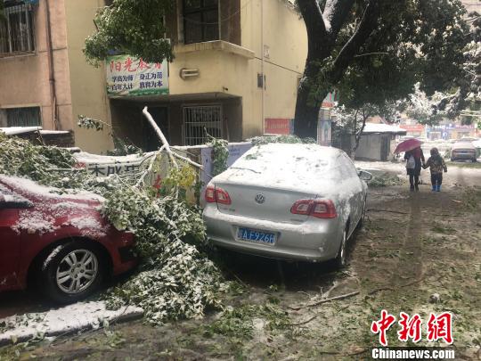 合肥一小區(qū)內(nèi),樹枝被積雪壓斷,砸在路邊停靠的車輛上。 趙強 攝