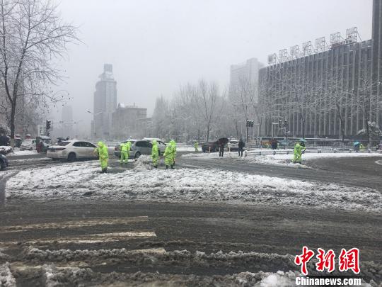 環(huán)衛(wèi)工人在鏟除積雪?!≮w強 攝