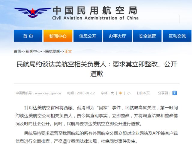 針對(duì)達(dá)美航空官網(wǎng)將西藏、臺(tái)灣列為“國(guó)家”事件,民航局高度關(guān)注,第一時(shí)間約談達(dá)美航空公司相關(guān)負(fù)責(zé)人,責(zé)令其查明事實(shí),立即整改,并將調(diào)查結(jié)果和整改情況及時(shí)向社會(huì)公開(kāi)。同時(shí),民航局要求達(dá)美航空立即公開(kāi)進(jìn)行道歉。