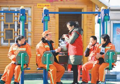 圖為一月十日,安徽省肥西縣環(huán)衛(wèi)工人在“愛(ài)心小屋”前喝熱水、曬太陽(yáng)。新華社記者 劉軍喜攝