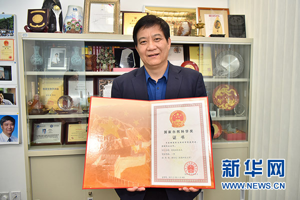 1月18日,唐本忠向記者展示他獲得的2017年度國家自然科學(xué)獎一等獎證書。新華社發(fā) (王璽 攝)