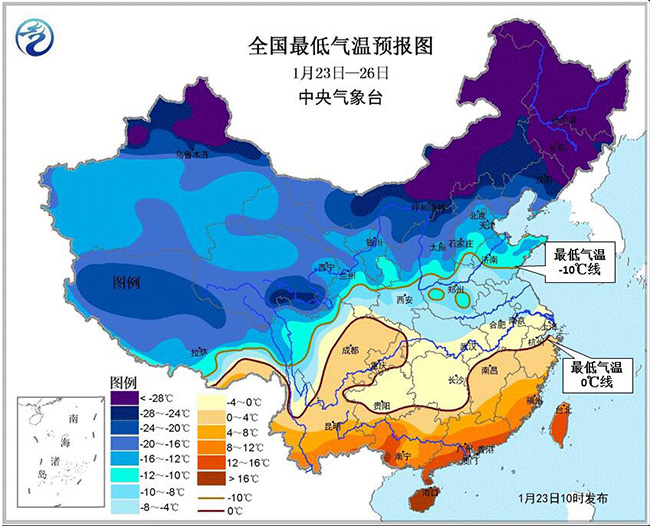 1月23日至月底,影響我國的冷空氣頻繁且勢力較強(qiáng)。23-26日,受強(qiáng)冷空氣影響,中東部大部地區(qū)自北向南先后有4~5級偏北風(fēng),陣風(fēng)6~7級;黃淮及其以南地區(qū)氣溫下降6~8℃,部分降溫幅度可達(dá)10~12℃。在此期間,中東部大部地區(qū)日平均氣溫較常年同期偏低2~5℃,部分地區(qū)偏低6℃以上。最低氣溫0℃線將南壓至浙江北部、江西北部、湖南南部至貴州南部一線,-10℃線位于甘肅東南部、陜西中部到河北南部、山東中部一線。我國東部和南部海區(qū)先后有6~8級、陣風(fēng)9~10級大風(fēng)。