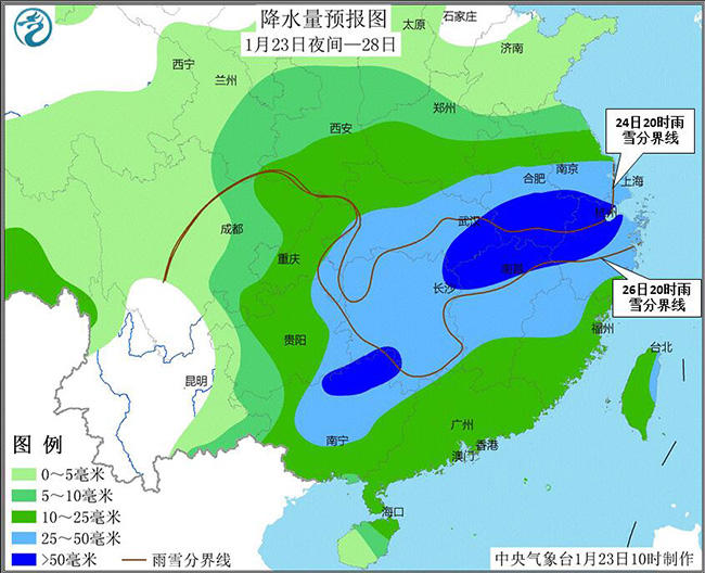 預(yù)計,直至28日,西北地區(qū)東部、黃淮西部和南部、江淮、江漢、江南北部等地先后有中到大雪或雨夾雪,其中陜西東南部、河南南部、湖北大部、安徽、江蘇南部、浙江西北部等地的部分地區(qū)有暴雪,局地大暴雪;貴州、湖南、湖北等地部分地區(qū)有凍雨。其中,降雪集中時段在1月24日-25日、27日。