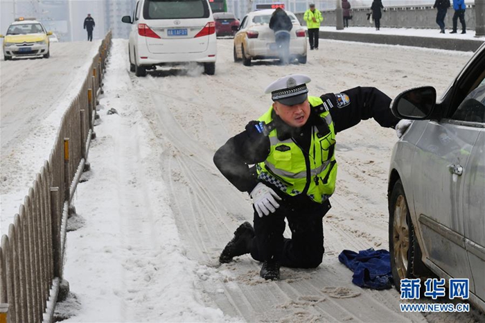 1月27日,在湖北省武漢市江漢一橋橋面,民警將衣服鋪墊在雪地上協(xié)助推車(chē)。新華社發(fā)(金思柳 攝)