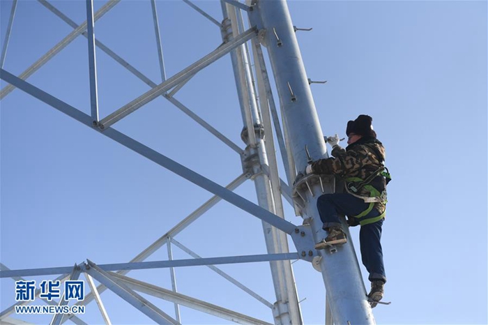 1月26日,國(guó)家電網(wǎng)長(zhǎng)春供電公司輸電運(yùn)檢室?guī)щ娮鳂I(yè)班班長(zhǎng)楊忠武徒手爬上高壓線塔。新華社記者 張楠 攝