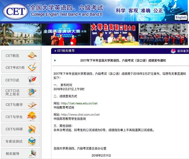據(jù)全國大學(xué)英語四、六級(jí)考試委員會(huì)辦公室發(fā)布的通知,2017年下半年全國大學(xué)英語四、六級(jí)考試(含口語)成績(jī)今天發(fā)布!