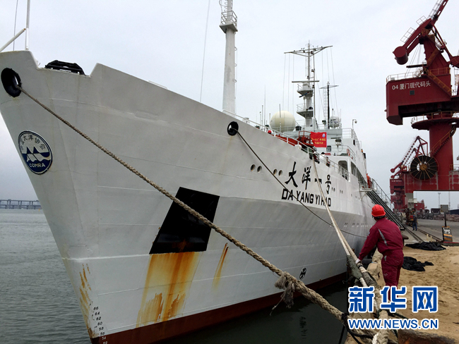 ??? 這是4月15日拍攝的停靠在廈門(mén)現(xiàn)代碼頭的“大洋一號(hào)”科考船。當(dāng)日,搭載“潛龍三號(hào)”無(wú)人無(wú)纜潛水器和70名科考隊(duì)員的“大洋一號(hào)”科考船從廈門(mén)起航,奔赴南海執(zhí)行“大洋一號(hào)”綜合海試B航段科考任務(wù)。這也是目前我國(guó)最先進(jìn)的自主無(wú)人潛水器“潛龍三號(hào)”首次出海。新華社記者 劉詩(shī)平 攝