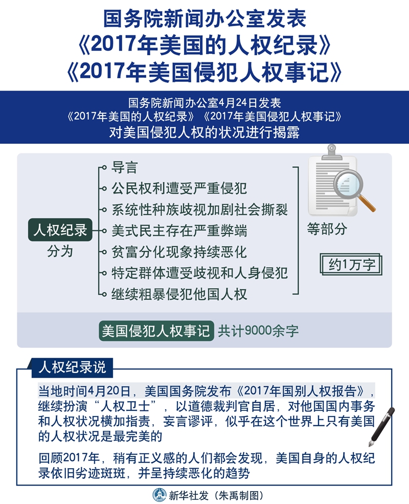 圖表:國務(wù)院新聞辦公室發(fā)表《2017年美國的人權(quán)紀(jì)錄》《2017年美國侵犯人權(quán)事記》 新華社發(fā)朱禹 制圖