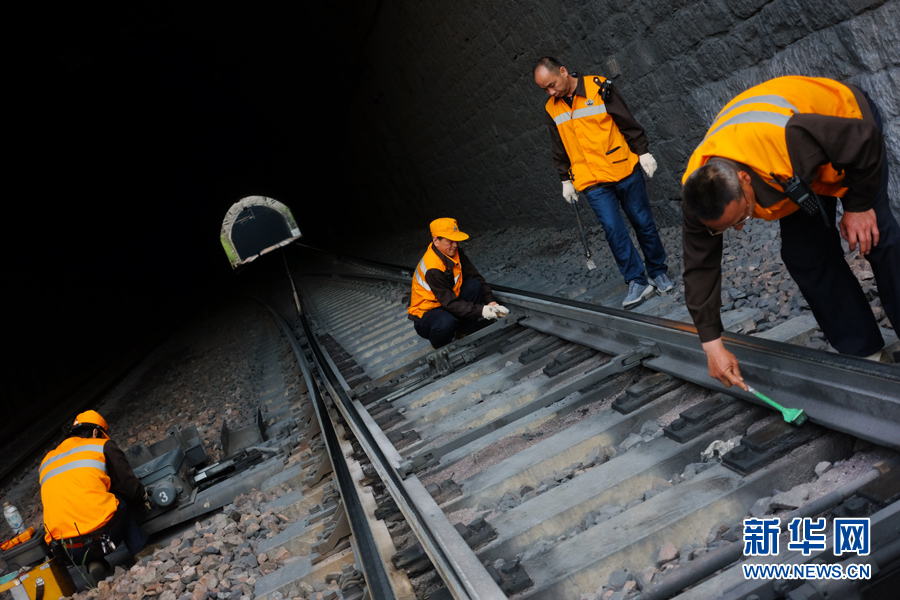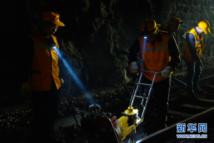 鐵路職工在隧道作業(yè)。他們的工作被稱為“改道”,要把兩條鐵軌距離與標準數(shù)據(jù)的誤差控制在-2mm到+6mm之間。新華網(wǎng)陳俊松 攝