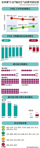 去年,為治理空氣污染,《京津冀及周邊地區(qū)2017-2018年秋冬季大氣污染綜合治理攻堅行動方案》和《2017年度空氣質(zhì)量改善目標(biāo)完成情況考核評估工作細(xì)則》發(fā)布。近日,生態(tài)環(huán)境部對“2+26”(京津冀大氣污染傳輸通道城市)城市空氣質(zhì)量改善目標(biāo)完成情況進(jìn)行評估考核,昨日發(fā)布考核結(jié)果。